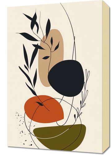 Obraz z serii minimalistyczne zatytułowany Orszak Natury. Kompozycja ta wyraża subtelny urok abstrakcji, przywołując na myśl symbiozę sztuki i natury. Użycie ograniczonej palety kolorystycznej, obejmującej zielenie, czerwienie, czernie i beże, dodaje pracę ciepła i naturalności, a zarazem utrzymuje jej prostą elegancję. Linie są zarówno płynne, jak i geometryczne, co tworzy interesujące przeciwstawienie i zachęca do refleksji nad formami w naturze. Owa grafika może wnieść spokój i równowagę wizualną do każdej przestrzeni, będąc zarówno delikatnym uzupełnieniem, jak i głównym punktem zainteresowania.