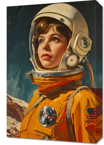 Obraz z serii pop art zatytułowany Pionierka Kosmosu. przedstawia kobietę astronautkę w klasycznym skafandrze kosmicznym, z wizjerem odbijającym gwiazdy i odległą planetę. Jej spojrzenie jest pełne determinacji i odwagi, a zarazem wyraża ciekawość i zadumę nad niewiadomymi, które czekają w głębi kosmosu. Barwy plakatu - bogate złoto skafandra i głęboka czerń przestrzeni kosmicznej - tworzą kontrast, który podkreśla odwagę i piękno eksploracji kosmicznej. Obraz ten jest hołdem dla wszystkich kobiet w historii podboju kosmosu i będzie doskonałą ozdobą dla każdej przestrzeni inspirowanej nauką, od domowych biur po edukacyjne instytucje, a także jako symbol siły i inspiracji dla pokoi młodzieżowych.