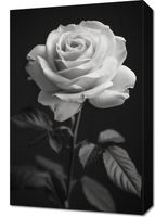 Obraz z serii wnętrza zatytułowany Płatki Róż. Obraz przedstawia ponadczasowy, monochromatyczny obraz róży. Róża, z delikatnymi i szczegółowymi płatkami, jest wyeksponowana na ciemnym tle, co wyostrza jej obrys i podkreśla subtelne niuanse jej formy. Gra światła i cienia nadaje głębi i trójwymiarowości, a ułożenie płatków w pełnym rozkwicie symbolizuje piękno i doskonałość. Liście i łodyga są skromne, ale wyraźne, dodając naturalności całej kompozycji. Obraz oddaje esencję delikatności i elegancji róży, co sprawia, że jest idealny dla każdego, kto szuka elementu dekoracyjnego o subtelnym pięknie i spokojnej, relaksującej estetyce.