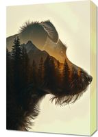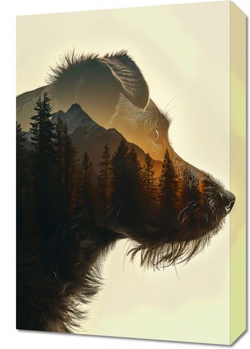 Obraz z serii natura zatytułowany Psi Duch Lasu ukazuje zjawiskowe połączenie sylwetki psa z krajobrazem górskim. Pięknie uchwycony profil psa, z jego czujnym spojrzeniem i delikatnymi liniami twarzy, płynnie przechodzi w malownicze góry, które wyłaniają się z jego sylwetki. Drzewa sosnowe i złociste światło zachodzącego słońca tworzą tło, które emanuje spokojem i harmonią. Kontur psa jest wyraźnie zarysowany, a jednocześnie subtelnie stapia się z przyrodą, co podkreśla nierozerwalną więź między zwierzętami a ich naturalnym środowiskiem. Ten obraz idealnie wpasuje się w wnętrza inspirowane naturą, w salonach miłośników zwierząt lub jako dekoracja w weterynaryjnych poczekalniach, przypominając o pięknie i sile natury oraz naszej odpowiedzialności za jej ochronę.