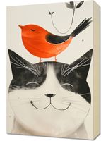 Obraz z serii abstrakcja zatytułowany Pyzaty Przyjaciel przedstawia uroczą, minimalistyczną ilustrację czarno-białego kota z zamkniętymi oczami i szerokim uśmiechem, na którego głowie spoczywa radosny, czerwony ptaszek. Kot ma charakterystyczne białe obszary wokół pyszczka, na którym wyraźnie rysują się czarne wąsy i delikatny nos. Ptaszek wydaje się być zadowolony, śpiewający, z zamkniętymi oczkami, co dodaje kompozycji wesołego i spokojnego nastroju. Tło jest jasne, z subtelnymi plamami i kropkami, które mogą imitować subtelny efekt spękanego płótna lub papieru. Po lewej stronie, na górze, widoczna jest wschodnia pieczęć, co nadaje pracy szczyptę orientalnego charakteru. Ta grafika mogłaby być idealnym, ciepłym dodatkiem do przestrzeni domowej, zwłaszcza do pokoju dziecka lub jako element dekoracyjny w przestrzeni wspólnej, przynoszący uśmiech i poczucie spokoju.