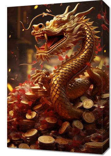 Obraz z serii motywy wschodnie zatytułowany Smok Bogactwa. Ilustracja ta ukazuje potężnego złotego smoka, symbol siły i pomyślności w wielu kulturach wschodnich, unoszącego się nad skarbami. Smok, z szeroko otwartymi szczękami, wydaje się ryczeć triumfalnie, otoczony przez wirujące złote monety i kwiaty, co dodaje kompozycji dynamizmu. Żywe kolory i szczegółowe wykonanie smoka sprawiają, że obraz jest pełen życia i energii. Obraz ten jest doskonałym wyborem dla miłośników sztuki orientalnej oraz jako element dekoracyjny wnętrz, które chcą wprowadzić elementy bogatej symboliki i kulturowej głębi, takich jak domowe biura, pokoje do medytacji czy ekskluzywne salony.