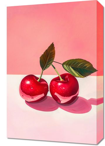 Obraz z serii wnętrza zatytułowany Soczyste Oczywiste ukazuje dwa soczyste, lśniące wiśnie z dwoma zielonymi liśćmi, które są połączone w jedną gałązkę, na pastelowym różowym tle z białą powierzchnią, na której odbijają się owoce. Wiśnie są przedstawione w realistycznym stylu, z widocznymi refleksami światła i kroplami wody, co nadaje im świeży i apetyczny wygląd. Zastosowanie cieni i światłocienia nadaje kompozycji głębi i trójwymiarowości. Dominujące ciepłe odcienie różu i czerwieni tworzą przyjemną i słodką atmosferę. Obraz może być interpretowany jako celebracja lata i dojrzałych owoców lub jako minimalistyczne podejście do tematu natury morte w nowoczesnym wydaniu. Idealnie nadawałby się jako element dekoracyjny do kuchni lub jadalni, wprowadzając żywy i kolorowy akcent.