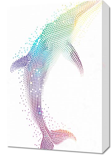 Obraz z serii pop art zatytułowany Spektrum Oceanu prezentuje sylwetkę skaczącego delfina, stworzoną z wielokolorowych kropek, które tworzą efekt gradientu przechodzącego przez całą paletę barw tęczy. Wzór punktowy nadaje ilustracji lekkości i eterycznego charakteru, a jednocześnie jest odzwierciedleniem złożoności i różnorodności życia morskiego. Tło jest czyste i delikatne, co pozwala na pełne skupienie na kolorowym, wizualnym przedstawieniu delfina. Obraz oddaje hołd pięknu i gracji stworzeń morskich, będąc jednocześnie świętowaniem koloru i ruchu. Idealny do pomieszczeń, które pragną wprowadzić elementy natury i koloru, takich jak pokoje dziecięce, przestrzenie życiowe, czy gabinety weterynaryjne.