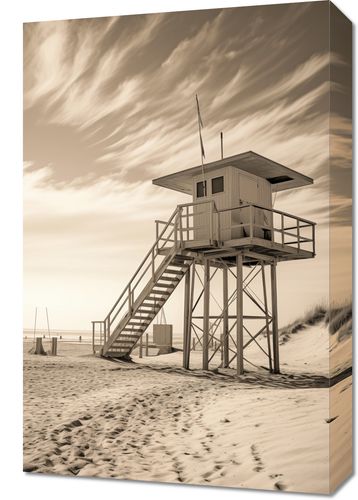 Obraz z serii pejzaże zatytułowany Strażnik Wydm. Prezentuje on sepiową scenę z wieżą ratownika na pustej plaży. Nostalgiczna tonacja obrazu podkreśla samotność struktury i piękno otaczającej ją dzikiej przyrody. Dramatyczne chmury na niebie i ślady na piasku prowadzą wzrok ku wieży, dodając głębi i historii miejscu. Ten obraz idealnie nadaje się do wnętrz, w których pragnie się wywołać uczucie spokoju, przestrzeni i czasów minionych, takich jak salony, pokoje wypoczynkowe, a także przestrzenie publiczne lub prywatne biura, które cenią sobie klasyczny wygląd i atmosferę.