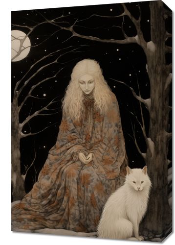 Obraz z serii wnętrza zatytułowany Stróżka Leśna. Ta eteryczna praca artystyczna ukazuje postać kobiecą, owiniętą w szatę z motywem leśnym, zatopioną w kontemplacji pod gałęziami drzew oplecionych przez śnieg i w blasku pełnego księżyca. Jej spokojna obecność i blady odcień skóry kontrastują z ciemnością nocy, a towarzyszący jej biały wilk dodaje elementu dzikości i tajemniczości. Obraz oddaje uczucie spokoju i jedności z naturą, a jednocześnie wzbudza ciekawość dotyczącą ukrytych opowieści i starych legend. Idealny dla miłośników fantastyki, mitologii, oraz tych, którzy pragną wprowadzić do swojego wnętrza elementy oniryczne i magiczne.