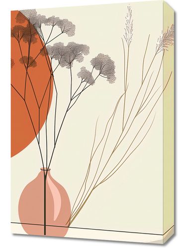 Obraz z serii boho zatytułowany Suszony Widok. Obraz ukazuje zgeometryzowane, stylizowane kwiaty suszonych roślin w wazonie na tle dużego, okrągłego słońca w ciepłych odcieniach pomarańczy i beżu. Kompozycja, w której dominują spokojne, jesiennie nastroje, łączy prostotę formy z bogactwem faktury. Obraz ten doskonale odnajdzie się w wnętrzach o prostym, lecz eleganckim wystroju, takich jak minimalistyczne salony, jadalnie czy hol. Idealnie wpasuje się w otoczenie zarówno nowoczesne, jak i te z nutą retro, wprowadzając ciepło i artystyczną, subtelność.