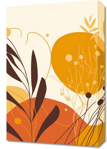 Obraz z serii minimalistyczne zatytułowany Szept Lasu. Spokojna i równoważąca kompozycja przedstawia zbiór roślin, wśród których przeważają delikatne i wydłużone liście. Kolorystyka grafiki oscyluje wokół ciepłych odcieni żółci, pomarańczy i brązu, co nadaje ilustracji przytulnego i spokojnego nastroju.Ta grafika będzie doskonale komponować się w przestrzeniach, gdzie chcemy stworzyć oazę spokoju, sprzyjającą relaksacji i odprężeniu. Może być wspaniałym dodatkiem do sypialni lub salonu, gdzie ciepłe barwy i natura mają pozytywny wpływ na samopoczucie.