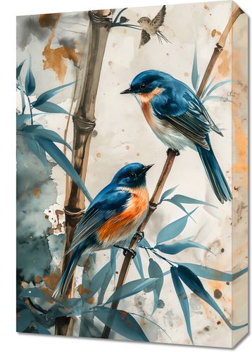 Obraz z serii natura zatytułowany Trzy Ptaki prezentuje trzy ptaki - dwa siedzące spokojnie na bambusowych gałązkach i jednego w locie - na tle akwarelowego, delikatnie zabarwionego krajobrazu. Ptaki, o intensywnie niebiesko-pomarańczowym upierzeniu, są przedstawione z wyraźnymi detalami, które kontrastują z bardziej abstrakcyjnym i eterycznym tłem. Plama akwarelowa łączy w sobie odcienie beżu i szarości, z subtelnymi akcentami złota, co dodaje kompozycji elegancji i lekkości. Ten obraz może przynieść uczucie spokoju i równowagi do każdego wnętrza, idealny dla salonów, przestrzeni wypoczynkowych, a nawet biur, gdzie naturalna piękność i spokój są cenione.