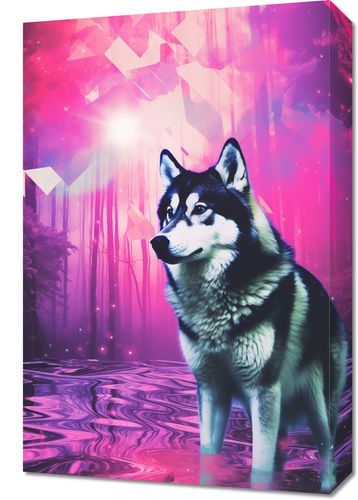 Obraz z serii pop art zatytułowany Wilczy Duch. Ta hipnotyzująca grafika łączy w sobie realistyczny wizerunek wilka z eterycznym, neonowym lasem w tle, co nadaje scenie onirycznego, mistycznego charakteru. Wilk, przedstawiony w pełnym majestacie, stoi na brzegu zaczarowanego jeziora, a tajemnicze, geometryczne kształty unoszą się w powietrzu, dodając kompozycji elementu fantastyki. Wyraziste kolory różu i fioletu tworzą niemal bajkową atmosferę. Obraz jest idealnym wyborem dla miłośników natury i jej mistycznych aspektów, świetnie nadaje się do wnętrz o tematyce przyrodniczej, pokojów dla młodzieży, lub jako unikatowy element dekoracyjny w przestrzeniach współczesnych.
