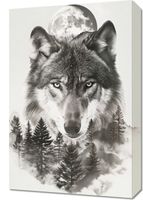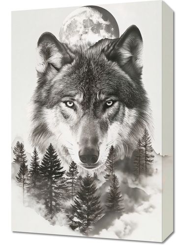 Obraz z serii natura zatytułowany Wilczy Duch Lasu przedstawia majestatyczną głowę wilka, której intensywne, przenikliwe oczy wydają się patrzeć prosto w duszę widza. Tło w odcieniach bieli i szarości tworzy iluzję mgły, która otula sylwetki drzew i zarysy gór. Ponad wilkiem unosi się pełnia księżyca, która rozświetla nocne niebo, dodając kompozycji tajemniczego i mistycznego charakteru. Ten obraz idealnie wpasuje się w przestrzeń miłośnika natury, wzbogacając każde pomieszczenie o element dzikiego i surowego piękna. Dzięki swojej symbolicznej sile i głębi będzie nie tylko dekoracją, ale również źródłem inspiracji i kontemplacji. Idealnie sprawdzi się w salonach, przestrzeniach wspólnych, bibliotekach, a także jako punkt centralny w galerii sztuki czy prywatnym biurze.