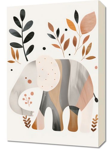 Obraz z serii wnętrza zatytułowany Wypocznij Mały przedstawia stylizowaną ilustrację słonia, wplecionego w delikatną kompozycję z abstrakcyjnymi elementami roślinnymi. Słoń jest przedstawiony w spokojnej, stonowanej palecie kolorów z akcentami ciepłych brązów, beżów i delikatnych szarości, co nadaje ilustracji elegancki i nowoczesny charakter. Proste, ale efektowne formy roślinne wokół słonia dodają plakatowi lekkości i harmonii, a dyskretne kropki i linie na ciele słonia tworzą wrażenie tekstury. Całość tworzy obraz spokoju i łagodności, idealny do wnętrz, w których chce się wprowadzić elementy natury i uspokajającej estetyki, takich jak salony, pokoje relaksacyjne lub przestrzenie dla dzieci.