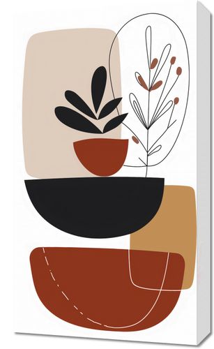 Obraz z serii minimalistyczne zatytułowany Botaniczna Abstrakcja. To artystyczne dzieło przedstawia stylizowane, botaniczne motywy ukryte wśród geometrycznych form. Delikatne rośliny w doniczkach uchwycone są w prostych, ale wyrafinowanych konturach, zaznaczających ich sylwetki na tle złożonego z ciepłych i neutralnych barw tła. Brązy i beże splatają się tu z głęboką czerwienią, tworząc organiczne poczucie natury uproszczonej do esencji formy. Ten obraz doskonale odnajdzie się w przestronnych, jasnych wnętrzach, gdzie natura spotyka się z minimalizmem - idealny do salonów w stylu skandynawskim, spokojnych gabinetów, lub jako ukojenie w dynamicznym, miejskim biurze.