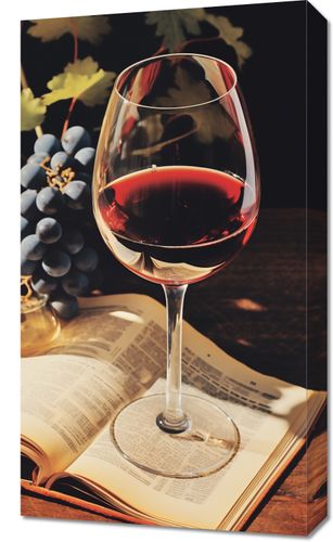 Obraz z serii wnętrza zatytułowany Bukiet Historii. Na tej zachęcającej ilustracji widzimy kieliszek czerwonego wina delikatnie spoczywający na otwartej stronie książki, z wyraźnym odbiciem na stronach. Obok kieliszka umieszczono grono dojrzałych winogron, a całość kompozycji znajduje się na ciemnym tle, co podkreśla bogactwo i głębię barw. Ten obraz oddaje przyjemność płynącą z połączenia relaksującej lektury z degustacją wybornego wina, idealny dla miłośników dobrych książek i enologii, świetnie sprawdzi się w domowych biblioteczkach, salonach degustacyjnych czy jako wyrafinowana dekoracja w winiarniach.
