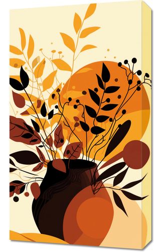 Obraz z serii minimalistyczne zatytułowany Bukiet Owoców. Grafika ta przedstawia estetyczny układ liści i owoców jesieni w klasycznym, ciemnym wazonie, umieszczony na tle ciepłych, okrągłych form w tonacji jesiennej palecie. Gama kolorów rozciąga się od intensywnego mahoń do miękkiego złota, przywołując uczucie ciepła, które towarzyszy złotej porze roku. Przemyślne rozpryski i drobne detale nadają całości dynamiki, sugerując żywotność i obfitość jesiennych plonów. Obraz ten idealnie odnajdzie się w przytulnych wnętrzach, wnosić będzie atmosferę spokoju i refleksji. Idealnie nadaje się do salonów, pokojów dziennych lub przestrzeni, gdzie dominuje naturalna paleta barw i materiałów.