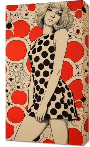Obraz z serii pop art zatytułowany Czerwone Kropki. Prezentuje modną kobietę w czarnej sukience w białe kropki, która pozuje na tle żywego, czerwonego tła z abstrakcyjnym wzorem kołowym. Jej postać i suknia są przedstawione w odcieniach czerni i szarości, co tworzy silny kontrast z tłem. Obraz oddaje ducha epoki pop-artu, łącząc minimalistyczny portret z dynamicznym i odważnym wzorem. Idealnie wpasuje się w nowoczesne wnętrza oraz przestrzenie kreatywne, takie jak studia projektowe, galerie sztuki czy modowe butiki.