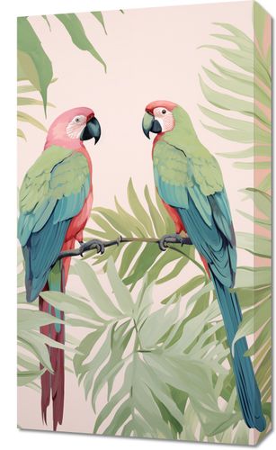 Obraz z serii wnętrza zatytułowany Dialog Ara. Na tej jasnej i pełnej życia ilustracji widzimy dwie papugi ary, które z gracją spoczywają na gałęzi, otoczone tropikalnymi liśćmi palm. Ich wyraziste, kolorowe upierzenie w odcieniach różu, zielonego i błękitu przyciąga wzrok i wprowadza egzotyczną atmosferę do każdej przestrzeni. Obraz ten jest idealnym wyborem dla miłośników natury i kolorowych, radosnych motywów, doskonale nadaje się do wnętrz, które pragną dodać odrobinę tropikalnego ciepła, takich jak jasne salony, dziecięce pokoje, a także jako dekoracja w kawiarniach i restauracjach o egzotycznym charakterze.