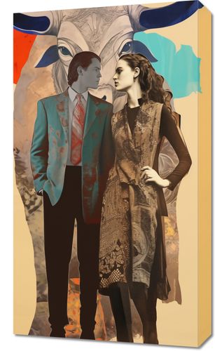Obraz z serii abstrakcja zatytułowany Dialog Kultur. Ten unikalny obraz przedstawia mężczyznę i kobietę w tradycyjnych strojach, stojących na tle abstrakcyjnego wizerunku byka, który może symbolizować siłę i dziedzictwo kulturalne. Ich ubiory, pełne tekstur i wzorów, w połączeniu z modernistycznym tłem, odzwierciedlają zetknięcie się różnych epok i wartości. Obraz wyraża ideę harmonii pomimo różnorodności, łącząc w sobie elementy historyczne z nowoczesną abstrakcją. Jest to doskonały wybór dla przestrzeni celebrujących różnorodność i bogactwo kulturowe.