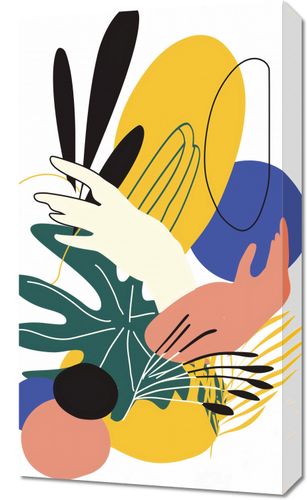Obraz z serii minimalistyczne zatytułowany Dotyk Tropików. Ten energetyczny i kolorowy obraz przedstawia abstrakcyjną, niemal surrealistyczną wizję tropikalnej roślinności. Wielobarwne kształty łączą się z naturalnymi elementami tworząc efektowną kompozycję, która oddaje bujność i różnorodność tropików. Paleta barw, od głębokiego granatu, poprzez jaskrawy żółty, aż po delikatne pastele, wnosi do wnętrza świeżość i egzotykę.Ten obraz jest idealnym wyborem dla wnętrz, które pragną wnieść żywiołowość i odrobinę egzotyki do codziennej przestrzeni. Doskonale uzupełni jasne i przestronne salony, a także stanie się inspirującym akcentem w kreatywnych pracowniach lub kawiarniach. Może również dodać charakteru nowoczesnym, minimalistycznym biurom, wprowadzając żywe barwy i organiczne motywy.