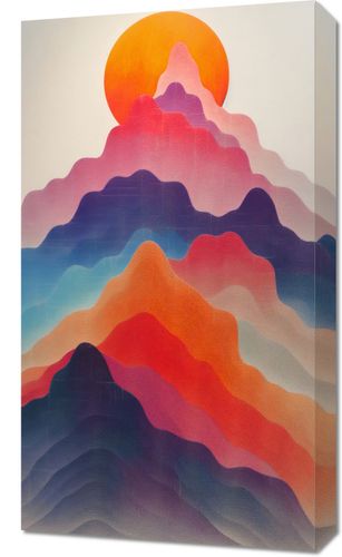 Obraz z serii abstrakcja zatytułowany Gama Gór to stylizowane przedstawienie majestatycznych gór, które tworzą warstwowe pasmo kolorów od głębokiego fioletu poprzez róż, czerwień, aż po ciepłe odcienie pomarańczu i żółci. Ta abstrakcyjna interpretacja krajobrazu górskiego z dużym, słońcem w odcieniach intensywnego pomarańcza w tle, nadaje dziełu atmosferę spokoju i medytacyjnej głębi. Delikatne tekstury i przejścia tonalne między warstwami nadają ilustracji poczucie trójwymiarowości i dynamiki. Obraz idealnie komponuje się z przestrzeniami, które cenią sobie naturę i spokój, nadając wnętrzom charakteru i głębi, doskonały do salonów, przestrzeni wellness, pokojów medytacyjnych lub jako akcent w nowoczesnych biurach.