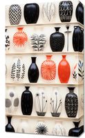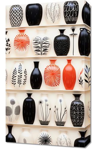 Obraz z serii wnętrza zatytułowany Gliniana Harmonia. Precyzyjnie ułożone wazony na półkach prezentują się niczym w muzeum sztuki użytkowej. Ich geometryczne i roślinne wzory, oscylujące między czernią, bielą i czerwienią, tworzą hipnotyzującą kompozycję. Prostota i elegancja tych przedmiotów, w połączeniu z ich zróżnicowaną fakturą i wzornictwem, dodają wnętrzom niepowtarzalnego charakteru. Idealnie komponują się zarówno w nowoczesnych loftach, jak i tradycyjnych pokojach kolekcjonera. Ta estetyczna kolekcja doskonale odda atmosferę w galeriach designu oraz w ekskluzywnych salonach z antykami.