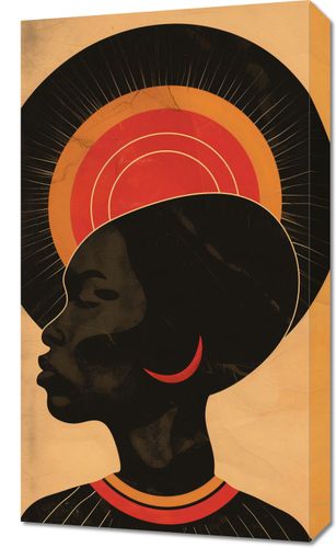 Obraz z serii abstrakcja zatytułowany Gorące Promienie to urzekający portret profilu kobiety, który wyraża siłę i spokojną godność. Jej sylwetka jest wyraźna i zdecydowana, z podkreślonymi, mocnymi liniami, a tło za jej głową tworzy aureolę w ciepłych odcieniach, od ciemnego poprzez jaskrawe odcienie pomarańczu do złota, co może symbolizować wschód lub zachód słońca. Te koncentryczne kręgi przypominają również halo, które często widnieje na obrazach świętych lub ikonach, nadając postaci niemal boski wymiar. Czarny kolor sylwetki w połączeniu z bogatymi, złotymi odcieniami tworzy mocny kontrast, który przyciąga wzrok i sugeruje tajemnicę oraz niezwykłą wewnętrzną siłę. Obraz ten jest elegancki i wyrazisty, doskonały do każdego wnętrza, w którym chce się podkreślić piękno, siłę i kulturowe bogactwo.