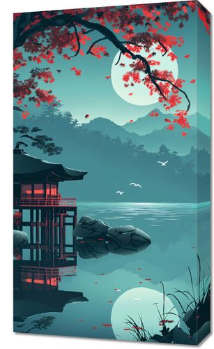 Obraz z serii motywy wschodnie zatytułowany Japoński Pawilon. Ten obraz emanuje spokojem dzięki scenie przedstawiającej tradycyjny japoński pawilon, otoczony przez wodę i delikatnie pochylające się czerwone liście klonu. Ciepłe światło wschodzącego księżyca i subtelne odbicie w wodzie podkreślają atmosferę ciszy i refleksji. Delikatne sylwetki przelatujących ptaków dodają element życia i ruchu. Obraz ten idealnie wpisuje się w przestrzenie współczesne, minimalistyczne, a także te, które celebrują naturę i spokój, takie jak pokoje do medytacji, jadalnie, czy też poczekalnie w spa.