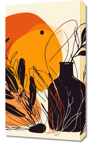 Obraz z serii minimalistyczne zatytułowany Jaskrawy Zachód. Na grafice widnieje silnie stylizowany motyw roślinny, gdzie czarne sylwetki roślin kontrastują z jaskrawo pomarańczowym i żółtym tłem, przypominającym zachodzące słońce. W tle pojawiają się delikatne, abstrakcyjne linie i kształty, dodające kompozycji głębi i tekstury.Ten plakat doskonale wpasuje się w wnętrza ożywione roślinnością, zarówno te domowe, jak i komercyjne przestrzenie typu kawiarnie lub sklepy z roślinami. Jego ciepłe barwy będą wprowadzać przytulną atmosferę i mogą stanowić żywy akcent w przestrzeniach utrzymanych w naturalnej kolorystyce.