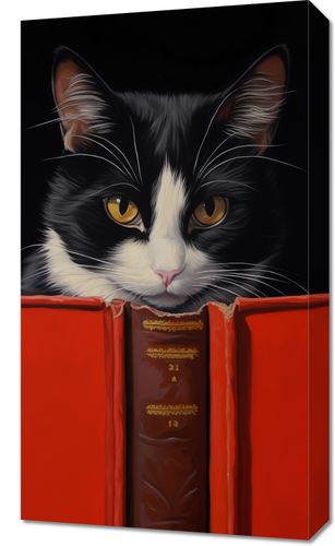 Obraz z serii wnętrza zatytułowany Koci Uczeń. Prezentuje on uroczego, czarno-białego kota z intensywnie żółtymi oczami, zaglądającego ciekawie do czerwonej, otwartej książki. Głęboki czarny tło podkreśla barwy i szczegółowe detale futra kota, a także złocenia na grzbiecie książki. Ten obraz łączy w sobie humor i ciepło, doskonale oddając osobowość i charakter kotów jako towarzyszy domowych. Idealny do umieszczenia w domowych bibliotekach, salonach czy pokojach dziecięcych, plakat ten dodaje wnętrzu przytulności i wprowadza zabawny, intelektualny element.