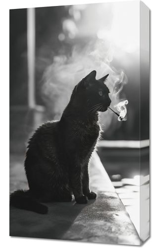 Obraz z serii wnętrza zatytułowany Kocia Przerwa. Na tym obrazie uwieczniono czarnego kota siedzącego na krawędzi, zanurzonego w promieniach rozproszonego światła, które podkreślają jego błyszczącą sierść i wyraziste kontury. Kocie wąsy delikatnie zarysowane w kontraście ze światłem nadają mu wyrazistości, a unoszący się dym tworzy aurę tajemniczości. Jest to obraz zarówno elegancki, jak i zagadkowy, idealny dla miłośników zwierząt i minimalistycznego designu. Obraz ten będzie pasował do każdego wnętrza, od klasycznego po nowoczesne, dodając subtelnego charakteru i spokoju.