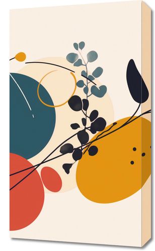 Obraz z serii minimalistyczne zatytułowany Kolaż Przyrody. Grafika ta łączy organiczne kształty i roślinne motywy z geometrycznymi figurami. Prezentuje bogate połączenie kolorów - od głębokiego granatu przez czerwień, musztardowy żółty po delikatne beże. Wyróżnia się przez obecność roślinnych sylwetek na pierwszym planie, które nadają kompozycji naturalnego charakteru.Ten obraz będzie wspaniałym dodatkiem do wnętrz, gdzie panuje spokój i równowaga. Jego stonowana, ale wyrazista kolorystyka sprawi, że będzie doskonałym uzupełnieniem przestrzeni skandynawskich, minimalistycznych, a nawet boho. Wydaje się być idealnym wyborem do salonu, sypialni lub miejsca pracy dla osób ceniących sobie połączenie sztuki i natury, gdzie mógłby stać się centralnym elementem dekoracyjnym.