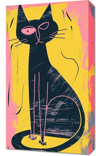 Obraz z serii abstrakcja zatytułowany Kontrastowa Kotka. Praca artystyczna przedstawia stylizowaną, abstrakcyjną sylwetkę czarnego kota na tle żywych, nieregularnych pociągnięć pędzla w odcieniach różu i żółci. Wzrok kota, zaznaczony jednym dużym różowym okiem, przyciąga uwagę i dodaje kompozycji charakteru. Mocne, geometryczne linie i intensywne kontrasty kolorystyczne tworzą nowoczesną i dynamiczną ilustrację, która przyciąga wzrok i staje się wyrazistym elementem dekoracyjnym. Obraz ten idealnie sprawdzi się w przestrzeniach miejskich, takich jak nowoczesne mieszkania, studia graficzne lub awangardowe kawiarnie, nadając wnętrzom śmiałości i wyjątkowego, artystycznego akcentu.
