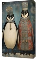 Obraz z serii wnętrza zatytułowany Królewskie Pingwiny. Ta ilustracja przedstawia parę pingwinów ubranych w bogato zdobione, królewskie szaty, które nadają im wygląd postaci z baśni lub z dawnych legend. Ich wytworne stroje, wypełnione drobnymi detalami i ornamentami, kontrastują z prostym tłem, które przywodzi na myśl zimowy, śnieżny pejzaż. Obraz ten wprowadza do wnętrza element kaprysu i elegancji, będąc idealnym wyborem dla przestrzeni pełnych fantazji, takich jak pokoje dziecięce, przestrzenie kreatywne, lub jako oryginalny akcent dekoracyjny dla miłośników nietuzinkowych i zabawnych dzieł sztuki.