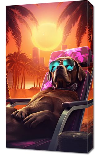 Obraz z serii pop art zatytułowany Lato w Stylu. Na tej zabawnej ilustracji widzimy psa rasy labrador, wygodnie ułożonego na leżaku plażowym, w okularach przeciwsłonecznych, z tłem zachodzącego słońca i palm. Jego relaksująca poza i luźny styl, w połączeniu z żywymi kolorami tropikalnego wschodu lub zachodu słońca, oddają atmosferę beztroskich wakacji. Obraz ten jest idealnym wyborem dla miłośników psów i letnich klimatów, świetnie nadaje się do dekoracji ścian w domach, hotelach nad morzem, czy jako dodatek do letnich barów i restauracji, wprowadzając element humoru i wakacyjnego luzu.