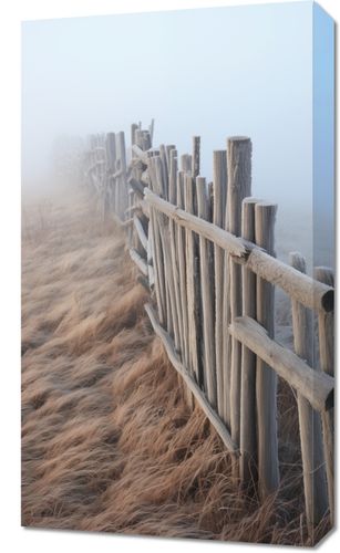 Obraz z serii pejzaże zatytułowany Mgła nad Wydmami. Prezentuje on eteryczny widok na drewniane ogrodzenie, które wiedzie przez poszarpane, suchą trawę wydm. Delikatna mgła otula scenę, nadając jej tajemniczość i spokój, a subtelne odcienie szarości i beżu tworzą uczucie miękkości i ciepła. Ten obraz idealnie oddaje atmosferę wyciszenia i rozmyślania, sprawiając, że jest doskonałym wyborem dla przestrzeni, które mają na celu uspokojenie i relaks, jak spa, pokoje medytacyjne, czy ciche kąciki w domach. To także piękny element dekoracyjny dla wnętrz inspirowanych naturą i spokojem przyrody.