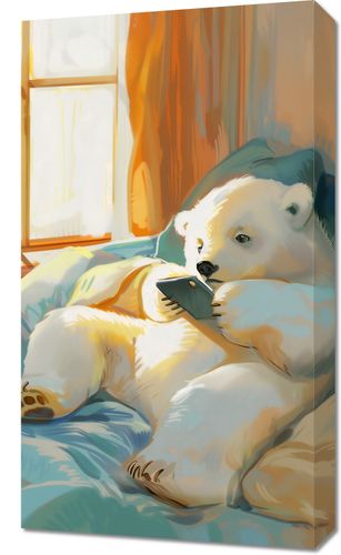 Obraz z serii abstrakcja zatytułowany Misiowe Popołudnie przedstawia uroczego, białego niedźwiadka polarnego, który odpoczywa na miękkiej pościeli, ciesząc się ciepłymi promieniami słonecznymi wpadającymi przez okno. Niedźwiedź wydaje się być zatopiony w lekturze, trzymając w łapach mały telefon, co dodaje humorystycznego i ludzkiego akcentu do sceny. Ciepła kolorystyka, od złocistych po pastelowe błękity, tworzy atmosferę spokoju i relaksu. Jasne światło i cienie na pościeli nadają głębi i tekstury, tworząc przytulne środowisko. Ten obraz doskonale wpasuje się w przestrzenie, które cenią sobie spokój i domowe ciepło, takie jak pokoje dziecięce, miejsca do czytania lub rodzinne salony.