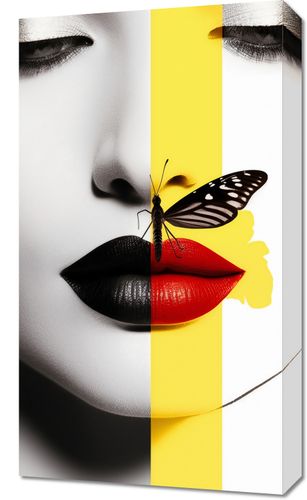Obraz z serii abstrakcja zatytułowany Motyla Piękność. Ten obraz przedstawia twarz kobiety podzieloną na dwa kontrastujące segmenty: jeden w czerni i bieli, drugi w żywych kolorach z motylem na ustach. Ilustracja eksploruje temat dualizmu natury ludzkiej, piękna i jego zmienności. Obraz ten jest idealnym wyborem dla przestrzeni o współczesnym designie, takich jak salony piękności, studia artystyczne, a także jako wyrazisty element dekoracyjny w nowoczesnych domach.
