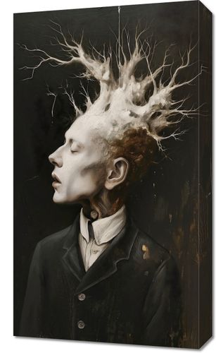 Obraz z serii abstrakcja zatytułowany Myśli Wzrastające prezentuje surrealistyczny portret mężczyzny, z którego głowy wyłania się skomplikowana struktura przypominająca korzenie lub gałęzie drzewa. Ten organiczny koronament wyrasta z myśli postaci, symbolizując rozwój, kreatywność i złożoność ludzkiego umysłu. Kontrast między żywą bielą i szarościami struktury a głębokim, ciemnym tłem sugeruje głębię i intensywność wewnętrznego świata postaci. Ten obraz może stanowić mocny wizualny akcent w przestrzeniach takich jak galerie, artystyczne pracownie, gabinety psychologiczne, a także we wnętrzach osób ceniących głębokie, filozoficzne refleksje.