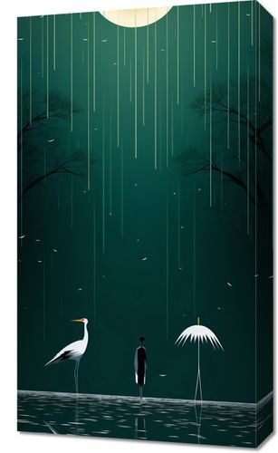 Obraz z serii wnętrza zatytułowany Nocne Marzenia. Scena przedstawia tajemniczą postać mężczyzny stojącego obok białej czapli, obaj są zanurzeni w wodzie i skierowani ku jasnoświecącemu księżycowi. Delikatne krople deszczu spadają z nieba, tworząc subtelną melodię natury, podczas gdy zarysy drzew rzucają cienie na monochromatyczne tło. Biały parasol unoszący się nad wodą dodaje elementu nieoczekiwanej magii i tajemniczości. Ta głęboka i metaforyczna kompozycja idealnie pasuje do nowoczesnych galerii sztuki, medytacyjnych przestrzeni oraz salonów czytania, gdzie cisza i kontemplacja dominują nad zgiełkiem codzienności.