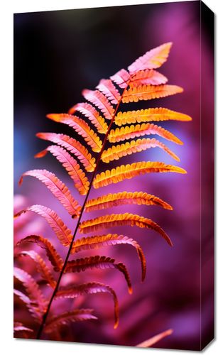 Obraz z serii natura zatytułowany Ogień Jesieni przedstawia pojedynczy liść paproci, który przechodzi przez spektrum ciepłych, jesiennych barw od żółci przez intensywną pomarańcz do głębokiego różu. Kontrastujące, żywe tło w odcieniach purpury podkreśla bogactwo i dynamikę liścia. Delikatne gradacje kolorów oraz wyraźna struktura paproci sprawiają, że obraz wydaje się niemal trójwymiarowy. Ta fotografia to idealny element dekoracyjny, który wprowadzi życie i ciepło do każdego wnętrza, nadając mu artystycznego charakteru. Doskonale sprawdzi się jako wyrazisty akcent w nowoczesnym salonie, sypialni lub biurze, szczególnie dla osób ceniących sobie naturę i jej niezwykłą paletę barw.