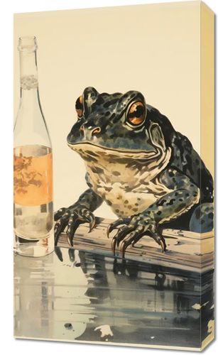 Obraz z serii motywy wschodnie zatytułowany Refleksje Błotniaka. Intrygujące spojrzenie żaby, podkreślane przez jasne, wyraziste oczy i lśniącą skórę, skontrastowane z delikatnym odbiciem w wodzie oraz subtelną butelką w tle, dodającego atmosfery spokoju i kontemplacji. Kolorowe detale butelki i intensywna zieleń żaby kontrastują z pastelowym tłem, wprowadzając do kompozycji nutę tajemniczości i głębokiego zastanowienia. Doskonale sprawdzi się w winiarniach o tematyce naturalnej oraz w przestrzeniach relaksacyjnych, takich jak salony spa czy ośrodki wellness.