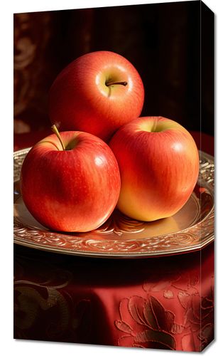Obraz z serii natura zatytułowany Rubinowe Ekscesy. Trzy soczyste jabłka o lśniącej rubinowej skórce, delikatnie ułożone na antycznym srebrnym talerzu o bogato zdobionych brzegach. Każde jabłko jest uchwycone w pełni swojego naturalnego piękna, z delikatnymi refleksami światła podkreślającymi ich świeżość i kuszący wygląd. Tło z głębokim czerwonym brokatem, dodaje głębi i luksusu kompozycji. Obraz idealnie komponuje się w przestrzeniach kulinarnych, takich jak restauracje wysokiej klasy czy domowe kuchnie, gdzie podkreśla znaczenie estetyki w prezentacji potraw.