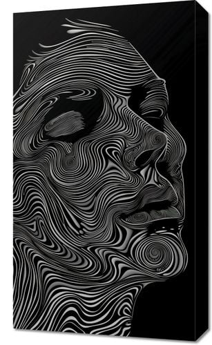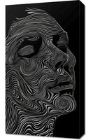 Obraz z serii abstrakcja zatytułowany Rysy i Zarysy. Przedstawia abstrakcyjny, linijny portret twarzy z profilu, wykonany w czerni i bieli. Wykorzystanie jednolitej, ciemnej palety barw w tle i białych, płynnych linii tworzy hipnotyzujący wzór, który przypomina topograficzną mapę, podkreślając kontury i rysy twarzy. Linie płyną po obrazie, tworząc złożone wzory, które formują oczy, nos, usta, i brodę postaci, dodając głębi i ruchu do kompozycji. Ten sposób przedstawienia podkreśla dynamikę i emocjonalne wyrazistość portretu, a zarazem zachowuje minimalistyczny charakter. Jest to stylowy i nowoczesny element dekoracyjny, który z pewnością przyciągnie uwagę i stanie się punktem centralnym każdego pomieszczenia.