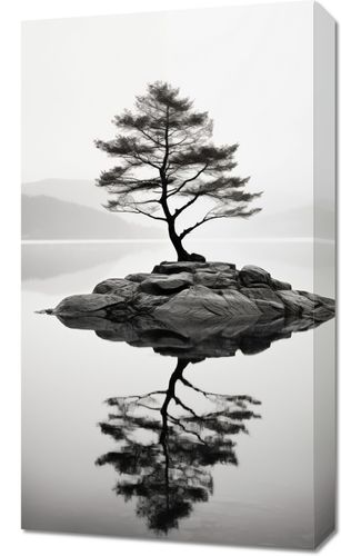Obraz z serii pejzaże zatytułowany Samotne Drzewo to monochromatyczne zdjęcie prezentujące unikalną scenę – pojedyncze drzewo wyłaniające się z kamiennej wysepki na tle spokojnej, lustrzanej powierzchni wody. Obraz jest ujęciem w tonacji czerni i bieli, co nadaje mu ponadczasowy charakter i podkreśla minimalistyczną estetykę. Silny kontrast między ciemnymi konturami drzewa a jasnym tłem wody tworzy głębię i przykuwa uwagę. Odbicie drzewa w wodzie tworzy symetryczny i spokojny obraz, który może wnosić element spokoju i zamyślenia do każdego otoczenia. Ten obraz będzie doskonałym wyborem dla osób ceniących naturę, minimalizm oraz sztukę fotograficzną, idealny do powieszenia w salonie, biurze, czy jako element dekoracyjny w przestrzeniach wellness i spa.