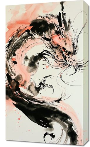 Obraz z serii motywy wschodnie zatytułowany Smocza Furia. Na tym obrazie przedstawiono smoka, którego sylwetka została uchwycona w dynamicznej, płynnej formie. Wschodnie wpływy są widoczne w użyciu tuszu i akwareli, co nadaje kompozycji zarówno delikatność, jak i siłę. Rozpryski i plamy tuszu tworzą wrażenie ruchu i spontaniczności, podczas gdy pastelowe odcienie różu dodają dziełu subtelności. Smok, symbol siły i mądrości w wielu kulturach, tu wydaje się być zarówno potężny, jak i eteryczny. Ten obraz będzie idealnym dodatkiem do przestrzeni, które celebrują kreatywność i siłę, takich jak studia artystyczne, biblioteki, a także prywatne kolekcje miłośników sztuki azjatyckiej.