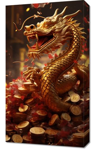 Obraz z serii motywy wschodnie zatytułowany Smok Bogactwa. Ilustracja ta ukazuje potężnego złotego smoka, symbol siły i pomyślności w wielu kulturach wschodnich, unoszącego się nad skarbami. Smok, z szeroko otwartymi szczękami, wydaje się ryczeć triumfalnie, otoczony przez wirujące złote monety i kwiaty, co dodaje kompozycji dynamizmu. Żywe kolory i szczegółowe wykonanie smoka sprawiają, że obraz jest pełen życia i energii. Obraz ten jest doskonałym wyborem dla miłośników sztuki orientalnej oraz jako element dekoracyjny wnętrz, które chcą wprowadzić elementy bogatej symboliki i kulturowej głębi, takich jak domowe biura, pokoje do medytacji czy ekskluzywne salony.