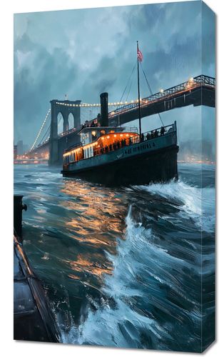 Obraz z serii abstrakcja zatytułowany Stary Parowiec uchwycił nostalgiczny obraz starego parowca przemierzającego wody przy mrocznym niebie, z tłem rozświetlonego mostu. Światła na parowcu rzucają ciepły blask na fale, tworząc złoty refleks na powierzchni wody, co kontrastuje z chłodnymi odcieniami burzowych chmur i zmierzchu. To malownicze przedstawienie, połączone z dynamiczną grą świateł i cieni, tworzy romantyczną i pełną atmosfery scenę, która przyciąga oko i wywołuje uczucie sentymentu do dawnych czasów. Idealnie nadaje się do zawieszenia w przestrzeniach, gdzie chcemy dodać element historycznej elegancji i marzycielskiego nastroju, takich jak biblioteki, studia, a nawet salony.