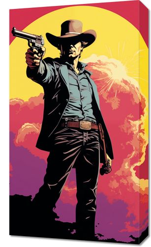 Obraz z serii pop art zatytułowany Strzelec z Epoki. Ten obraz przedstawia postać klasycznego kowboja w akcie wystrzału, z tłem wschodzącego słońca, które rozświetla scenę w ciepłych odcieniach czerwieni i pomarańczy. Silny kontrast i zdecydowane linie wydobywają charakterystyczne cechy postaci, od kapelusza po detale na szelkach i pasie. Obraz ten jest hołdem dla kultury westernów i bezkresnych amerykańskich przestrzeni, idealny dla miłośników historii i kinematografii, a także jako wyrazisty element dekoracyjny w miejscach takich jak domy, bary tematyczne lub sale kinowe.