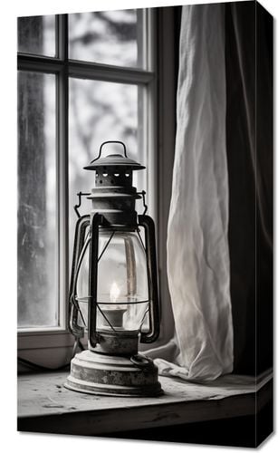 Obraz z serii wnętrza zatytułowany Światło Wspomnień. Na tym nastrojowym zdjęciu widzimy klasyczną latarnię naftową umieszczoną na parapecie przy oknie, przez które prześwituje delikatne światło zimowego dnia. Monochromatyczna paleta barw oraz subtelne detale takie jak rdzawe ślady na latarni i lekko zmierzwiona zasłona nadają głębi i charakteru. Ten obraz to sentymentalny powrót do czasów, kiedy blask świecy był codziennością, a każde źródło światła miało swoją historię. Idealny do wnętrz urządzonych w duchu nostalgii, takich jak rustykalne domy, klasyczne biblioteki, lub jako akcent w nowoczesnych przestrzeniach, wprowadzający element kontrastu i ciepła.