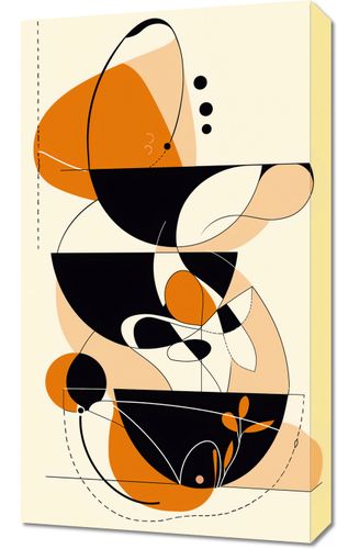 Obraz z serii minimalistyczne zatytułowany Taneczne Kręgi.Ta grafika przyciąga uwagę dynamicznym zastosowaniem form i kolorów. Czarne i pomarańczowe elementy na jasnym tle sprawiają, że kompozycja tętni życiem, podkreślając witalność i ruch. Abstrakcyjne kształty krążą wokół siebie w harmonijnym tańcu, tworząc wizualną symfonię, która może być interpretowana na wiele sposobów. Można doszukać się w nich zarówno organicznych form, jak i bardziej strukturalnych, architektonicznych motywów, co dodaje tej pracy wielowymiarowości. Wydaje się być idealnym uosobieniem nowoczesności z nutą klasyki, mogącym pasować do wielu współczesnych przestrzeni.